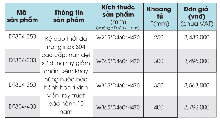 Kệ dao thớt đa năng inox 304 cao cấp.nan dẹtsử dụng ray giảm chấn, kèm khay hứng nước,bảo hành han rỉ vĩnh viễn, ray trượt bảo hành 10 năm.