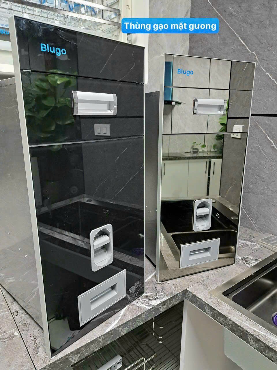 Thùng gạo mặt gương đen/ trắng, nhấn nút, chất liệu thùng inox cao cấp.